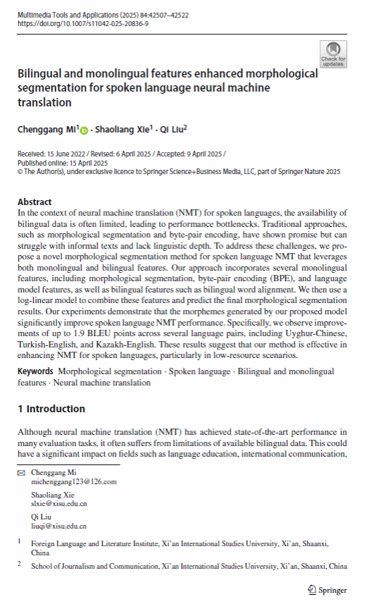 近日,研究院米成刚博士、谢韶亮博士,新闻与传播学院刘琪在国际学术期刊Multimedia Tools and Applications上合作发表题为Bilingual and monolingual features enhanced morphological segmentation for spoken language neural machine translation的论文。
